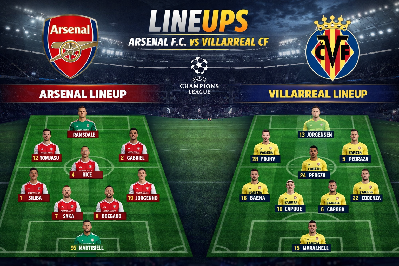 This table clearly shows that both teams are full of high-quality talent. The Arsenal F.C. vs Villarreal CF lineups are balanced and ready for a very tough fight on the pitch.